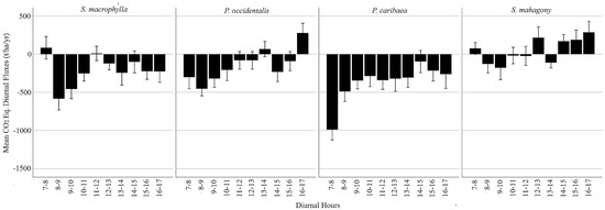 Over 10 h, CO2-Eq. fluxes were measured in the 16 different SUs. A total of 2587 measurements were taken and averaged to obtain 640 hourly averages (10 h × 4 stands × 4 species × 4 periods). To express fluxes in CO2 Eq. units, the CO2, N2O, and CH4 fluxes were converted according to IPCC standards for each gas (CO2 = 1; N2O = 298; and CH4 = 24) over a 100-year time horizon [35]. We also considered the molar mass ratio of C, obtained by dividing the CO2 molar mass = (12.0107 + (15.9994 × 2) = 44.0095 g/mol by the molar mass of C = 12.0107, equaling 3.67.