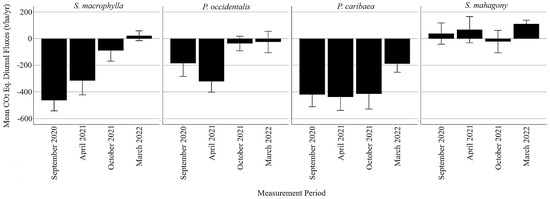 Our research assesses the effects of four forest species, namely, Swietenia macrophylla King, Swietenia mahagoni (L.) Jack., Pinus occidentalis Swartz, and Pinus caribaea Morelet var. Caribaea, on the soil and litter organic carbon (C) stocks, C dioxide equivalent balance (BCO2 Eq.) diurnal, and periodic dynamics beneath these species. Reforestation projects in the study region cover 1200, 543, 770, and 1152 hectares, respectively, with these four species being the most relevant in reforestation projects within the country. To determine the BCO2 Eq. per unit area, we compared the greenhouse gas (GHG) fluxes of carbon dioxide (CO2), methane (CH4), and nitrous oxide (N2O) expressed as CO2 Eq. units with the organic C stocks found in the mineral soil to a depth of 30 cm and in the forest litter. In four measurement periods over 18 months, we conducted field measurements in sixteen stands, four per species. Our results indicate that S. mahagoni emitted the lowest CO2 Eq., while S. macrophylla released the highest amount into the atmosphere. At the end of the 18 months, BCO2 Eq. from S. macrophylla soils was 299.70 metric tons ha−1 year−1, while for P. occidentalis, P. caribaea, and S. mahagoni, the corresponding quantities were 103.64, 146.41, and 72.34, respectively. All species showed a general upward pattern in soil respiration from September 2020 to March 2022. The average CO2 Eq. flux rates to the atmosphere were approximately 65.4, 51.1, and 75.9 percent higher in S. macrophylla soils compared to the respective rates of P. occidentalis, P. caribaea, and S. mahagoni.