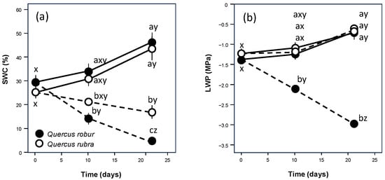 Time course of soil volumetric water content (SWC) (a) and leaf water potential (LWP) (b) over the experimental period for 5-month-old Quercus robur (filled circle) and Quercus rubra (empty circle) seedlings under two drought intensity levels. Continuous (–) and dashed (– – –) lines indicate watered and drought conditions, respectively. Values are the means of five replicates ±1SE. If shown, a, b, and c indicate significant differences between the different treatments within each sampling point; x, y, and z indicate significant differences between different sampling points within each treatment (LSD, p < 0.05).