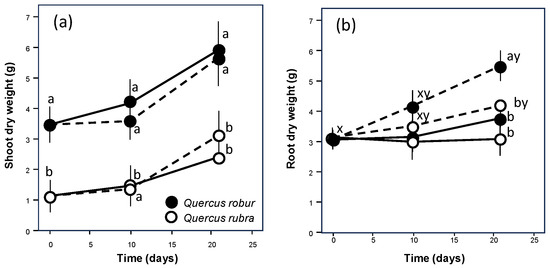 Time course of shoot (a) and root (b) growth over the experimental period for 5-month-old Quercus robur (filled circle) and Quercus rubra (empty circle) seedlings under two drought intensity levels. Continuous (–) and dashed (– – –) lines indicate watered and drought conditions, respectively. Values are the means of five replicates ±1SE. If shown, a, b and c indicate significant differences between the different treatments within each sampling point; x, y and z indicate significant differences between different sampling points within each treatment (LSD, p < 0.05).
