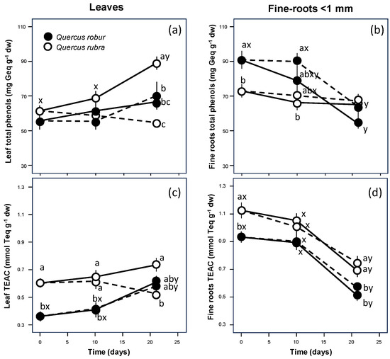 The antioxidant capacity showed a pattern similar to that observed for the polyphenol content, as demonstrated by the significant positive correlation for both leaves (Table 2, p < 0.001) and fine roots (p = 0.01). For the leaves, the difference became significant, with Q. robur showing values significantly lower than Q. rubra (Table 1, p < 0.001; Figure 3c). In the fine roots, unlike the polyphenol content, the antioxidant capacity was significantly lower in Q. robur than in Q. rubra (Table 1, p < 0.001; Figure 3d). Moreover, the values did not change significantly in either species after 10 days since the beginning of the treatment. Still, at the end of the experiment, they decreased significantly (Table 1, p < 0.001) to values similar to those of leaves.