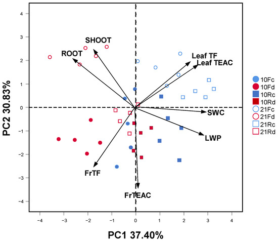 Principal component analysis (PCA) ordination of the first (37.40% of explained variance) and second (30.83% of explained variance) axes, showing the relationships between physiological traits only for the leaves, and chemical and biomass traits for both leaves and fine roots (arrows) under two drought intensity levels (blue: control (c); red: drought (d); filled: 10 days; empty: 21 days) in 5-month-old Quercus robur (circle, F) and Quercus rubra (square, R) seedlings. SWC, soil water content; LWP, leaf water potential; SHOOT, shoot dry mass; ROOT, root system dry mass; TF, total polyphenols; TEAC, Trolox-equivalent antioxidant capacity; Fr, fine roots.