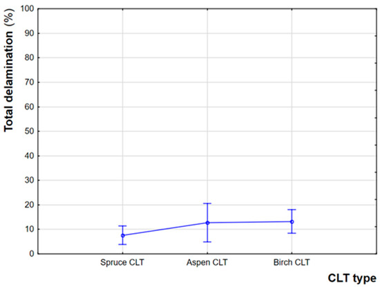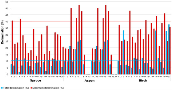 - The minimum criteria for maximum and total delamination (Delamtot ≤ 10%, Delammax ≤ 40%), as defined by EN 16351 [11], were variably met. 70% of spruce CLTs passed the delamination test (80% meeting the Delamtot requirements and 95% meeting the Delammax requirements). However, aspen CLTs only met the minimum delamination criteria in 60% of cases (60% meeting both the Delamtot and Delammax requirements), while only 45% of birch CLTs passed the delamination test (65% meeting the Delamtot requirements and 80% meeting the Delammax requirements).