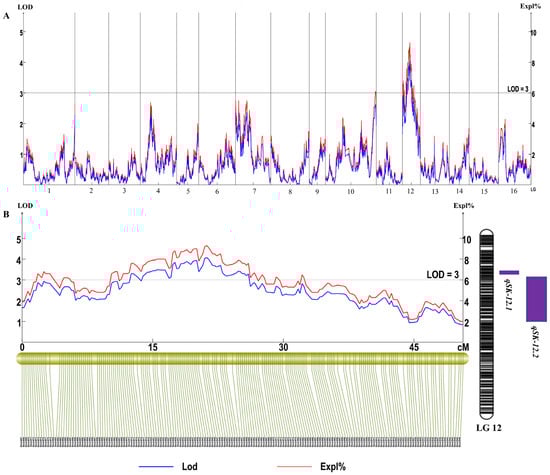Result of QTL mapping for shikimic acid content in sweetgum. (A) LODs score and phenotypic variation explained (%) of markers for shikimic acid content on 16 LGs. (B) Distributions of QTLs on LG12.