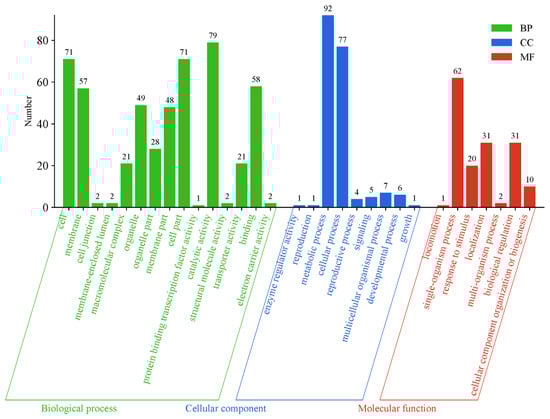 The analysis revealed that the region of QTL qSK-12.1 spans from 17,037,373 bp to 17,204,647 bp on chromosome 12. Due to its relatively short interval, no genes were detected within the QTL qSK-12.1 that were associated with shikimic acid content. In contrast, the QTL qSK-12.2 covers a more extensive interval, ranging from 17,220,616 bp to 21,068,059 bp on chromosome 12. This interval housed 213 genes, with 205 functionally annotated through a database comparison, identifying numerous enzymes related to secondary metabolism (Tables S2 and S3). Gene Ontology (GO) enrichment analysis indicated significant enrichment of these genes in biochemical processes, with a total of 350 genes distributed across 15 secondary annotations of biochemical processes (Figure 3). Notably, the ‘metabolic process’ category encompassed the highest number of genes, totaling 92, underscoring the substantial influence of plant metabolism on shikimic acid content.