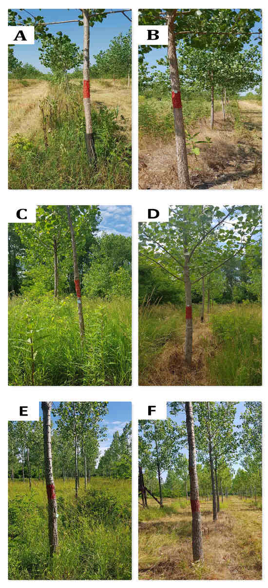 Experimental field: (A) control in one-year-old poplars; (B) treatment in one-year-old poplars; (C) control in two-year-old poplars; (D) treatment in two-year-old poplars; (E) control in three-year-old poplars; (F) treatment in three-year-old poplars.