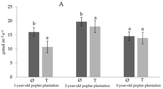 Parameters of net photosynthesis rate A (µmol m−2 s−1) in one-, two- and three-year-old poplar plantations: Ø—control; T—treatment; a, b—different letters indicate significant differences (p < 0.05) between values after Tukey’s (HSD) test.