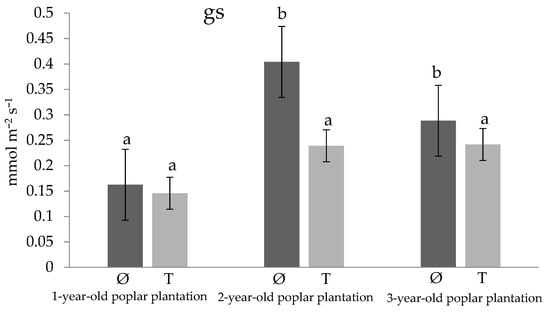 Parameters of stomatal conductance gs (mmol m−2 s−1) in three-, two- and one-year-old poplar plantations: Ø—control; T—treatment; a, b—different letters indicate significant differences (p < 0.05) between values after Tukey’s (HSD) test.