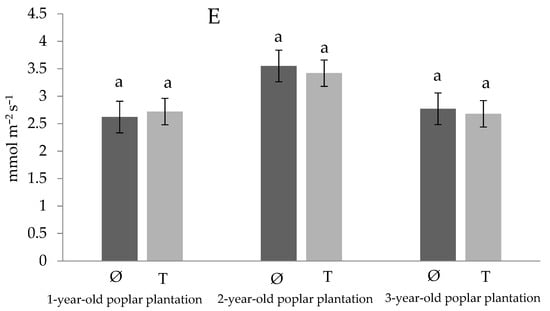 Parameters of transpiration E (mmol m−2 s−1) in one-, two- and three-year-old poplar plantations: Ø—control; T—treatment; a—same letters indicate no significant differences (p < 0.05) between values after Tukey’s (HSD) test.