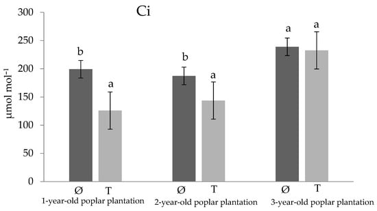 Parameters of intercellular concentration of CO2 (Ci µmol mol−1) in one-, two- and three-year-old poplar plantations: Ø—control; T—treatment; a, b—different letters indicate significant differences (p < 0.05) between values after Tukey’s (HSD) test.
