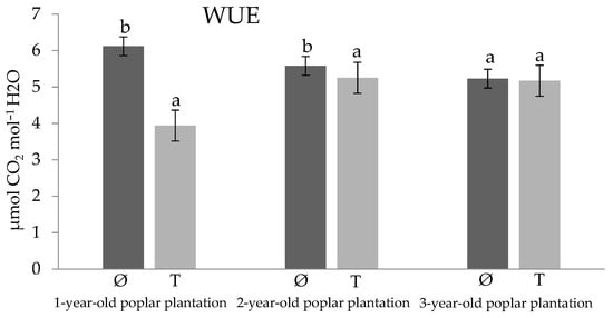 Parameters of water use efficiency WUE (µmol·CO2·mmol−1·H2O) in three-, two- and one-year-old poplar plantations: Ø—control; T—treatment; a, b—different letters indicate significant differences (p < 0.05) between values after Tukey’s (HSD) test.