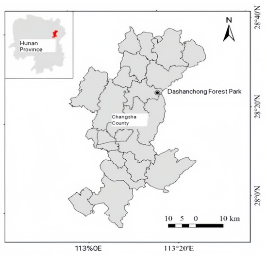 The sampling site for this study was located in a state-owned forest farm within the Dashanchong Forest Park, Junction Town, Changsha County, Hunan Province, China (28°23′58″−28°24′58″ N, 113°17′46″–113°19′08″ E). This region is located in the hilly area of central Hunan, and the overall topography gradually decreases from east to west, with an elevation between 55 and 260 m (Figure 1), making it a typical low-hill landscape. The soil of the study area is clayey loamy red soil with slate and shale as its parent rock, which is well drained and has high humidity. It is located in the humid monsoon zone of the central subtropics, with an average annual rainfall of 1416.4 mm, of which the period April–August experiences the most concentrated rainfall. The average annual temperature is 17.2 °C, with a minimum temperature of −11 °C in January and a maximum temperature of 40 °C in July and August. The top vegetation of the area used to be subtropical broad-leaved evergreen forest, but undue human interference and destruction have led to extensive destruction of native vegetation, which was partially restored at a later stage through planting and maintenance. Currently, the forest types in the region are a combination of extensive plantation coniferous forests and secondary forests composed of a wide range of natural tree species that have been created through forest closures.