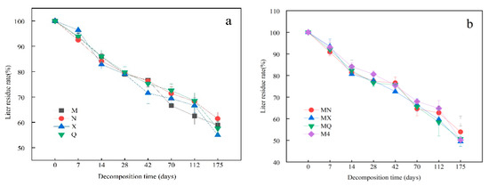 During decomposition of litter material, the litter group’s decomposition efficiency is faster or slower as evidenced by high or low mass residuals. After 175 days of indoor incubation, the litter mass residue rates of different tree species combinations showed a decreasing trend with decomposition time (Figure 2). In the mixed group, the rate of decline was faster than that of the separate group, and the dry matter residue rates of different withered leaves were, in descending order, as follows: N Group (61%) > M Group (59%) > Q Group (58%) > X Group (55%) > MN Group (54%) > MQ Group (51%) > M4 Group (50%) > MX Group (49%). Among these four pure species, C. camphora decomposed the fastest, followed by C. glauca, with a final residual rate of 58.89% for P. massoniana (Figure 2a). When the withered leaves of P. massoniana were mixed with other broadleaf withered leaves, the mixed withered leaves of the group showed a lower dry matter residual rate than the pure P. massoniana at 175 days. This phenomenon suggests that the addition of other broad-leaved forest foliage to P. massoniana foliage promotes its decomposition, with the most pronounced effect in the case of C. camphora, where the decomposition rate was 49%, a decrease of nearly 9% compared with P. massoniana foliage alone.