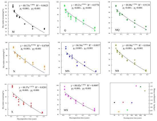 Olson negative exponential decay models, decay rate decomposition of different leaf litters. R2 represents the complex correlation coefficients of equations, and p1 and p2 represent the significance of regression equations and regression coefficients, respectively (p < 0.05 is significant). The abbreviation letters represent as: M, P. massoniana; N, C. axillaris; X, C. camphora; Q, Q. glauca; MN: P. massoniana + C. axillaris; MX: P. massoniana + C. camphoar; MQ: P. massoniana + Q. glauca; and M4: P. massoniana + C. axillaris + C. camphora + Q. glauca.