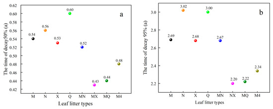 Time for 50% and 95% decomposition of different leaf litters. (a) represents the half-life of litter decomposition, and (b) represents the turnover period of litter decomposition.