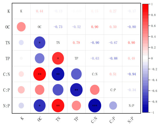 According to the Pearson correlation analysis (Figure 5), the decomposition coefficient, k, was not significantly correlated with the initial total carbon (OC), total nitrogen (TN), total phosphorus (TP), initial C/N, C/P, and N/P of the litter during the decomposition process.