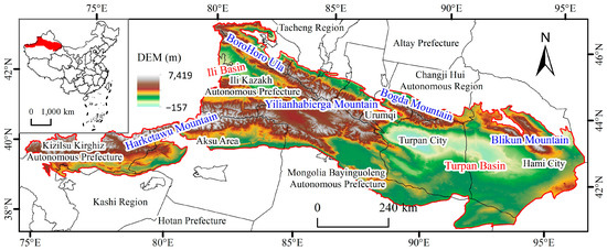 The Tianshan region (73°80′28″96°38′56″ N, 39°21′40″45°38′8″ E) extends across the central part of Xinjiang, covering an area of approximately 46.53 × 104 km2. The region accounts for 28.01% of the total area of Xinjiang, encompassing the Tianshan Mountains and the Turpan Basin [32]. Located in the interior of Central Asia, the Tianshan Mountains are renowned as the world’s largest independent latitudinal mountain system (Figure 1). Measuring 1852 km in length, it comprises over 20 mountain ranges and more than 10 intermountain basins, including the Bolokenu Mountains, the Harketawu Mountains, the Yilianhabierga Mountains, the Bogda Mountains, and the Balikun Mountains. It spans 11 prefectures and cities, including the Kizilsu Kirghiz Autonomous Prefecture, the Kashgar Prefecture, and the Aksu Prefecture. The average elevation of the mountain ridge is 4000 m, with the highest peak being the Tumur Peak at 7443 m.