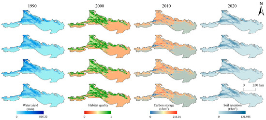 The spatial distribution of the ESs in the Tianshan region from 1990 to 2020 is shown in Figure 2. The spatial patterns for the WY, HQ, CS, and SC were similar, with the highest values predominantly found in grassland zones, forest zones, river valleys, and intermountain basins. All of these areas had good vegetation cover. The lowest values were concentrated in desert zones and snow/ice zones. Figure 3 shows that from 1990 to 2020, the WY and SC values increased near the Harketawu Mountains, with SC increasing more rapidly. However, near the Bogda Mountains and Blikun Mountains, the WY and SC decreased, with SC decreasing more rapidly, while the HQ and CS remained relatively stable. In the hot spot analysis, the WY, HQ, CS, and SC exhibited similar spatial distributions, with hot spots primarily located in the BoroHoro Ula Mountains and Yilianhabierga Mountains, and cold spots mainly located in the Turpan Basin.