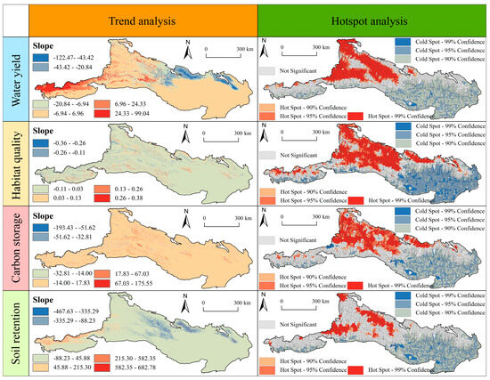 Hot and cold spots in terms of ESs are areas within a region with relatively strong or weak ES provisioning [44]. The Getis-Ord Gi* tool is available on the ArcGIS platform and can be used to reflect the clustering of high-value areas and low-value areas in space. Details are provided in reference [45,46].