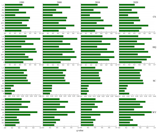Figure 4 indicates that the precipitation was the primary explanatory factor for the WY (q = 0.91, the same for the average value below). The amount of precipitation received directly determines the water volume in the surface and groundwater reserves, thereby affecting the WY. Therefore, the changes in the WY were closely related to the changes in the precipitation and areas with high precipitation corresponded to areas with a high WY. Soil type, potential evapotranspiration (PET), and the normalized difference vegetation index (NDVI) were the primary explanatory factors for the HQ (q = 0.68, q = 0.62, and q = 0.60, respectively). The soil type determines the growth environment of plant roots, thereby affecting plant growth and distribution. Different soil types have different water retention capacities, air permeabilities, and nutrient contents, which directly affect plant growth and habitat quality. The PET is the sum of plant transpiration and soil evaporation, reflecting the plant’s water demand and water utilization in the environment. A high PET may indicate a greater water demand by plants, while a low PET may indicate sufficient water supply in the environment [56]. Therefore, there is a close relationship between the PET and habitat quality. The NDVI is an indicator used for assessing vegetation cover. High NDVI values typically indicate dense vegetation, while low NDVI values indicate sparse vegetation. Vegetation cover is directly related to habitat quality [57], because abundant vegetation can improve soil quality, protect water sources, and maintain the ecological balance. Changes in the HQ were closely related to the changes in these factors. The primary drivers of CS were the soil type and NDVI (q = 0.53 and q = 0.56), which both affect the HQ and CS capacity by influencing vegetation growth, soil nutrient cycling, and water retention. The main factor influencing SC was the PET (q = 0.28) and changes in the SC were closely related to changes in the PET.