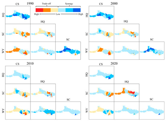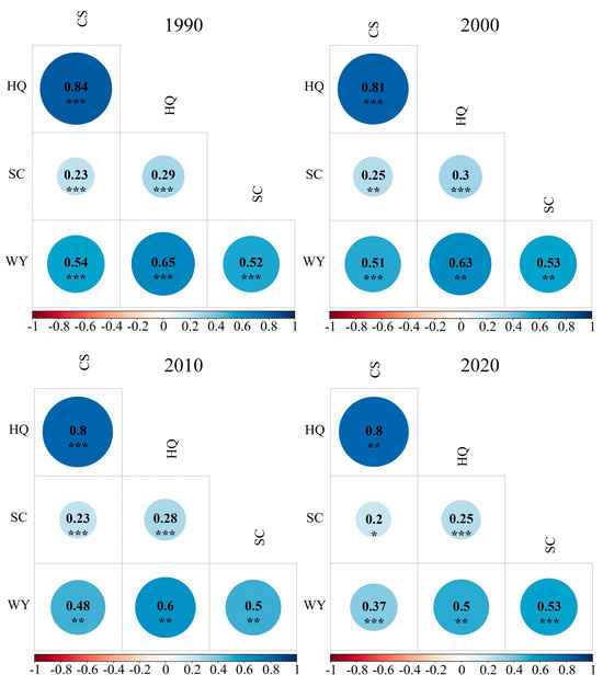 The interaction between the four ES functions of WY, HQ, CS, and SC, were investigated using the R4.0 software and Pearson correlation analysis (Figure 5). From 1990 to 2020, the WY, HQ, CS, and SC, all displayed a synergistic relationship. Significant positive correlations were observed between the water yield and CS, HQ, and SC, with correlation coefficients of 0.54, 0.65, and 0.52, respectively. Similarly, soil conservation showed significant positive correlations with CS and HQ, with correlation coefficients of 0.23 and 0.29, respectively. Habitat quality was significantly positively correlated with CS, with a correlation coefficient of 0.8. The correlations between WY, HQ, CS, and SC, in the Tianshan Mountains, in 2000, 2010, 2015, and 2020, were consistent with the trends in 1990.