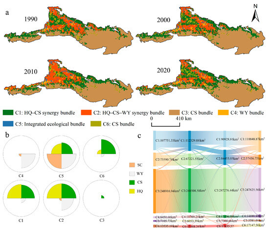 The SOM process identified six ES bundles (Figure 7): the HQ–CS synergy bundle (C1), the HQ–CS–WY synergy bundle (C2), the CS bundle (C3), the WY bundle (C4), the integrated ecological bundle (C5), and the CS bundle (C6). It was found that C1 was mainly distributed in the low altitude Ili Basin and the plains surrounding five mountain ranges; C2 was predominantly found in the high-altitude Bolokenu, Harketawu, and Yilianhabierga Mountains, while C3 was primarily located in desert regions (such as the Turpan Basin); C4 and C5 were scattered in the central and northwestern parts of the Tianshan Mountains; and C6 was mainly distributed in the Ili Basin. According to Figure 7c, from 1990 to 2000, the C1, C4, and C6 areas displayed an expanding trend, while C2 and C5 displayed a decreasing trend, and C3 remained relatively unchanged. The most prominent transition during this period occurred from C2 to C1. From 2000 to 2010, the C2, C4, C5, and C6 areas displayed an expanding trend, while C1 displayed a decreasing trend, and C3 remained relatively unchanged. The most prominent transition during this period occurred from C1 to C2 and C3. From 2010 to 2020, the change trends in terms of the six ES bundles were the same as those from 1990 to 2000, with C1, C4, and C6 displaying an expanding trend, C2 and C5 displaying a decreasing trend, and C3 remaining relatively unchanged. The most prominent transition during this period occurred from C2 to C1. Overall, from 1990 to 2000, the C1, C4, and C6 areas increased by 11097.54, 6240.2, and 3612.37 km2, respectively, while the C2 and C5 areas decreased by 18,133.99 and 1524.72 km2, respectively, and the C3 area remained relatively unchanged.