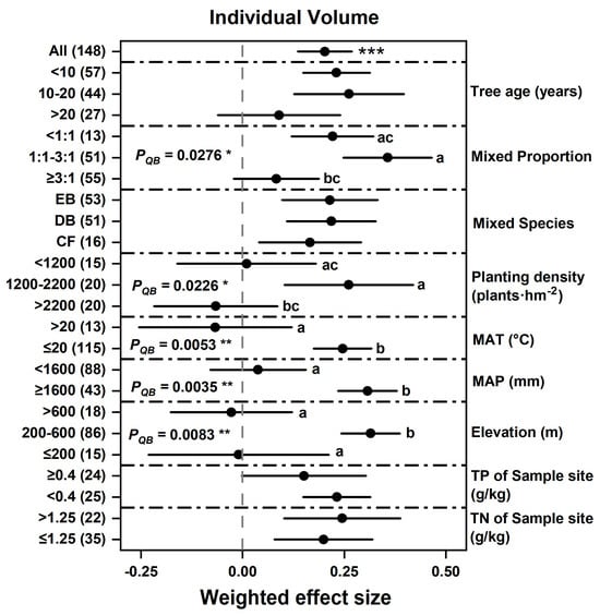 The individual volume increased by 24.6% at the sites with MAT greater than 20 °C (PQB = 0.0053; Figure 2). The individual volume at the sites with MAP less than 1600 mm increased more significantly than that of those with MAP greater than 1600 mm (30.7% vs. 3.8%) (PQB = 0.0035; Figure 2). Additionally, significant differences in the magnitude of the effect were observed across different elevation gradients (PQB = 0.0083; Figure 2). The individual volume of Chinese fir between 200 m and 600 m elevation increased by 31.5%, whereas no significant difference was detected at lower or higher elevations compared to in pure plantation (Figure 2). The individual volume increased by 15.1% and 23.2% at the site with TP greater than or less than 0.4 g/kg, respectively (Figure 2). There were significant differences in the effects on tree height in areas with different TP, and those with TP lower than 0.4 g/kg increased more significantly than those with TP higher than 0.4 g/kg (9.1% vs. 3.6%) (PQB = 0.038, Figure S2). The individual volume increased by 24.5% and 20.0% at the sites where TN was greater than or less than 1.25 g/kg, respectively (Figure 2).