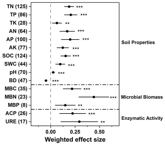 Effects of mixed plantations on soil properties, microbial biomass, and extracellular enzyme activities. The x-axis represents the weighted effect values. Soil properties encompass total nitrogen (TN), total phosphorus (TP), total potassium (TK), available nitrogen (AN), available phosphorus (AP), available potassium (AK), soil organic carbon (SOC), soil water content (SWC), pH, and bulk density (BD). Microbial biomass includes microbial biomass carbon (MBC), microbial biomass nitrogen (MBN), and microbial biomass phosphorus (MBP). Enzyme activities include acid phosphatase activity (ACP) and urease activity (URE). Error bars represent 95% confidence intervals (CIs) of the weighted effect size. When the 95% CIs do not overlap zero, this indicates that the effect of root exudate surrogates is statistically significant (p < 0.05). The sample size of each variable is in parentheses. *** and ** denote p < 0.001 and <0.01 respectively. The sample size of each variable is in parentheses.