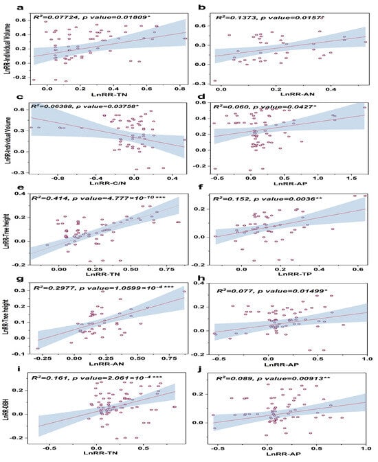 Relationships between the effect sizes (LnRRs) of individual volume with total nitrogen (TN) (a), available nitrogen (AN) (b), carbon nitrogen ratio (C/N) (c), and available phosphorus (AP) (d); between tree height with TN (e), total phosphorus (TP) (f), AN (g), and AP (h); and between DBH with TN (i) and AP (j). Linear regressions were used with red lines. Blue areas represents the 95% confidence intervals. ***, ** and * denote p < 0.001, <0.01, and <0.05, respectively.