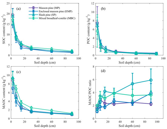 The distribution characteristics of various forms of soil organic carbon (SOC) content in the soil profile in four plantations. Subfigures show (a) SOC content, (b) particulate organic carbon (POC) content, (c) mineral-associated organic carbon (MAOC) content, and (d) the ratio of MAOC to POC. Error bars indicate standard deviation across replicates.