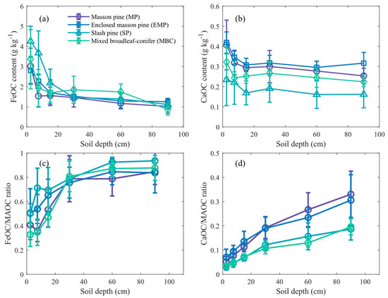 The distribution characteristics of various forms of mineral-associated organic carbon (MAOC) content in the soil profile in four plantations. Subfigures show (a) iron-aluminum-bound organic carbon (FeOC) content, (b) calcium-bound organic carbon (CaOC) content, (c) the ratio of FeOC to mineral-associated organic carbon (MAOC), and (d) the ratio of CaOC to MAOC. Error bars indicate standard deviation across replicates.