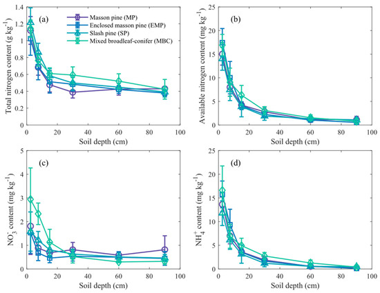 The contents of four nitrogen forms in soil layers of various forest types. Subfigures show (a) total nitrogen content, (b) available nitrogen content, (c) nitrate nitrogen (NO3−) content, and (d) ammonium nitrogen (NH4+) content. Error bars indicate standard deviation across replicates.