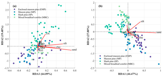 Two-dimensional ordination plot of redundancy analysis between soil carbon and nitrogen contents, and soil physicochemical properties in the topsoil layer (0–20 cm, (a)) and the subsoil layer (>20 cm, (b)).