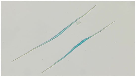 The samples were cut tangentially using Leica SM 2000 R sliding microtome. The obtained scrapings were placed in the 2 mL Eppendorf tubes and immersed in a maceration mixture consisting of hydrogen peroxide (30%) and glacial acetic acid (99.5%) in a 1:1 ratio. Maceration took place in a Memmert 30 incubator at 60 °C and lasted for 24 h. After that, the samples were rinsed three times with distilled water and left there for 7 days in order to further rinse the residual maceration mixture. Next, the samples were flooded with Etzold dye for a period of 24 h to stain the tested fibers blue, which facilitated subsequent microscopic observations. Later, the samples were rinsed with a 1:1 mixture of distilled water and glycerol to remove unbound dye. Other cell types (i.e., parenchyma, vessels), which constituted a negligible fraction of the produced substance, were excluded. Then, we prepared the microscope samples for fiber analyses using Olympus SZH10 Research stereo binocular, a 1:1 mixture of distilled water and glycerol, 25 mm × 75 mm subslides, and 24 mm × 40 mm coverslips, as well as an anatomical needle. The slides were placed under OLYMPUS PROVIS AX70 microscope with OLYMPUS UC90 camera and images of individual fibers were taken using cellSens Standard software (www.olympus-lifescience.com, accessed on 30 November 2024). We collected 15 libriform fibers from each sample tested (Figure 1).