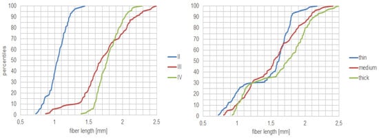 Length is one of the most diversified traits of in wood fibers, even within individual trees. This attribute is responsible for high-strength properties, so the paper and pulp industry utilize wood with long fibers (1–3.5 mm in length). However, fibers from deciduous tree species have fiber lengths within approximately 1–2 mm, which, in general, is less than the fiber lengths observed in coniferous species [,,]. High-strength properties in sheets of paper are obtained through the use of wood with long fibers (>1.7 mm). Intermediate fibers (0.5–1.7 mm) reduce static properties and increase dynamic strength properties, while short fibers (<0.5 mm) increase static strength properties [].