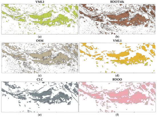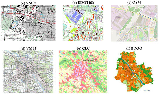 Exemplary visualizations of utilized spatial data sources. (a) Vector Map Level 2 (VML2); (b) Topographic Object Database (BDOT10k); (c) OpenStreetMap (OSM); (d) Vector Map Level 1 (VML1); (e) Corine Land Cover (CLC); (f) General Geographic Object Database (BDOO).