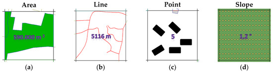 Sample land cover parameters for a primary field: (a) area (e.g., forest layer); (b) line (e.g., road layer); (c) point (e.g., building layer); (d) slope.