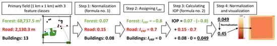 Equation (1) incorporates all object classes present in the spatial database. A specific class can be excluded from the analysis by either removing it or assigning it an IVRF of 0, meaning that it does not influence the passability. - The resulting IOP values are then normalized to a continuous scale ranging from 0 to 1.