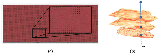 A detailed description of the method outlined above is provided in [46] and in Figure 6. As a result of applying the algorithm, eighteen passability maps were generated (using six spatial databases, with maps created for each database for three different primary field sizes). To compare the contents of these maps within the test area, control points were randomly placed on a 500 m × 500 m grid (Figure 7a). For each of these points, passability data for the corresponding basic field were collected (Figure 7b).