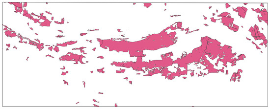 - BDOO (General Geographic Object Database, civil development, the timeliness of the information 2021). This database corresponds to a map with a scale of 1:250,000 and was developed by generalizing data from BDOT10k. As a result, both datasets share a similar structure and organization [43]. These data are available from the Polish National Geoportal [44]. The forest data were extracted from the layer “PTLZ”.