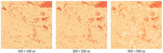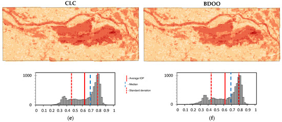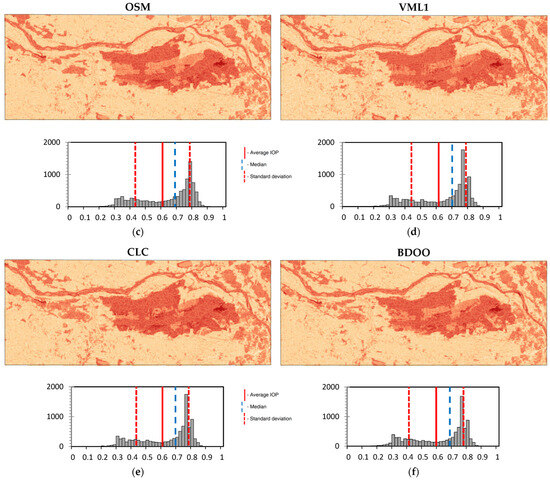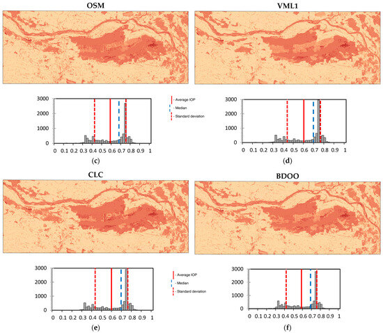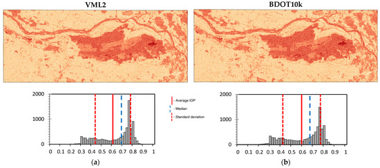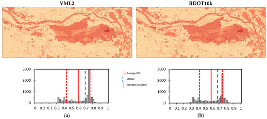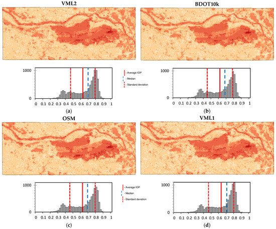 Based on the “forest” layer from all of the analyzed spatial databases, passability maps were generated. These maps were created for three different primary field sizes: 100 m × 100 m (Figure 10), 200 m × 200 m (Figure 11), and 500 m × 500 m (Figure 12). In addition to the visualizations, the figures display the distribution of the IOP values. Furthermore, Pearson correlation matrices and basic statistical parameters of the IOP distribution were calculated (Table 3, Table 4 and Table 5).