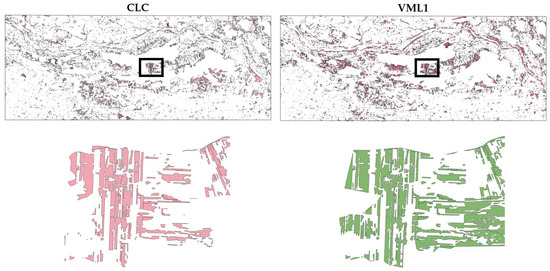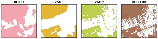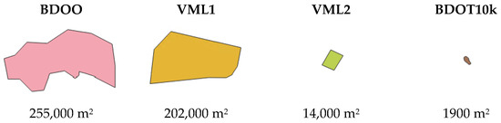 These results reflect the different methods used to determine forest areas during the vectorization (creation) of these data sources. In the case of BDOO, areas were merged and simplified during generalization, which artificially increased the area marked as forest and extended its range to areas not actually covered by forests. In the case of the VML1 database, a different technique was applied—small forest fragments were simply removed, leading to a reduction in the forested area within this database (Figure 14).