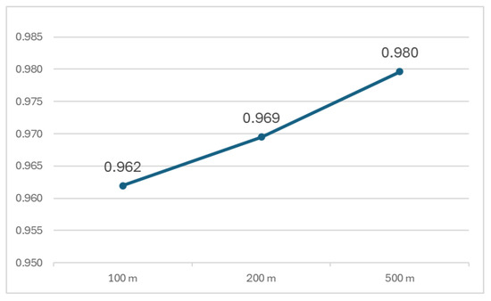 A highly intriguing aspect of this study was the analysis of correlation coefficients between the generated maps. These coefficients compared the calculated IOP values and were determined for all combinations of maps (across all datasets and primary field sizes). The first notable observation was that these coefficients were consistently very high. The lowest correlation value was 0.944 (BDOO—VML1), while the highest reached 0.996 (OSM—BDOT for 500 × 500 m fields). This strongly supports the conclusion that the overall content of all of the generated maps was highly similar. The degree of similarity was highest when comparing detailed passability maps (BDOT, OSM, VML2), with correlation values ranging from 0.96 to 0.99. For less detailed datasets, the average correlation values were slightly lower, between 0.94 and 0.97. Particularly interesting insights emerged from the analysis of average correlation coefficients calculated for each primary field size (Figure 17).