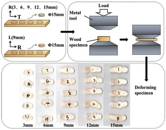 With the rapid development of the national economy, the increasing demand for wood resources across society is becoming more pronounced. Presently, China is the largest consumer, processor, and trader of wood globally with an annual wood consumption exceeding 600 million m3 [1,2]. Despite the presence of artificial fast-growing forests in China, the demand for large-diameter, high-quality timber still heavily relies on imports, with the external dependence for commercial timber reaching nearly 60% [3]. To alleviate the pressures on wood supply and promote sustainability and stability, the exploration of efficient wood utilization methods has emerged as a crucial topic in the wood processing industry. In recent years, wood thermoplastic compression-molding technology has garnered attention [4]. This technology entails subjecting wood to compression under controlled moisture and heating conditions, inducing significant internal shear stress in the material, resulting in the deformation and slippage of wood cells [5]. By integrating wood into various plastic-forming processes within industries such as metals and plastics, this technology not only enhances traditional wood processing methods in terms of performance and waste reduction, but also preserves the natural texture and strength of wood [6]. It allows for the rapid production of intricately shaped wooden products, presenting a novel approach to expanding wood utilization.