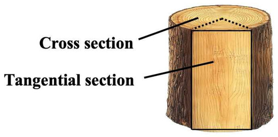 Wood samples were cut into 20 μm-thick cross and tangential sections using a rotary microtome (YAMATO REM-710, Shanghai Verde Instrument Technology Co., Ltd., Shanghai, China), and the section diagram is shown in Figure 2. These sections were stained with Safranin, dehydrated in anhydrous ethanol, and permanently mounted. The prepared slides were examined and photographed using an optical microscope (OLYMPUS-BX51, Beijing Precise Instrument Co., Ltd., Beijing, China) to capture images of the wood cross and tangential sections. ImageJ 1.53 software was employed to calculate the area percentage of various cellular structures in the cross-section, determining the proportions of vessels, wood fibers, axial parenchyma, and ray cells in hardwoods, as well as the proportions of axial tracheids, axial parenchyma, ray cells, and resin canals in coniferous wood.