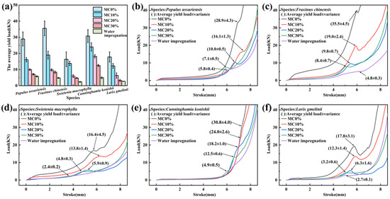 Compression tests under different moisture contents. (a) The average yield load; (b) Populus ussuriensis; (c) Fraxinus chinensis; (d) Swietenia macrophylla; (e) Cunninghamia konishii; (f) Larix gmelinii.
