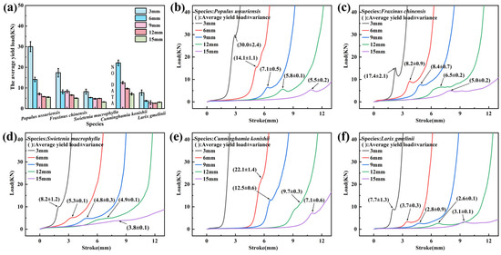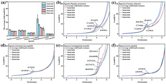 Compression tests under different compression rates. (a) The average yield load; (b) Populus ussuriensis; (c) Fraxinus chinensis; (d) Swietenia macrophylla; (e) Cunninghamia konishii; (f) Larix gmelinii.