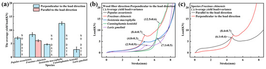 Compression tests under different fiber directions. (a) The average yield load; (b) Perpendicular to the load direction; (c) Fraxinus chinensis.