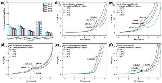 Compression tests under different temperatures. (a) The average yield load; (b) Populus ussuriensis; (c) Fraxinus chinensis; (d) Swietenia macrophylla; (e) Cunninghamia konishii; (f) Larix gmelinii.