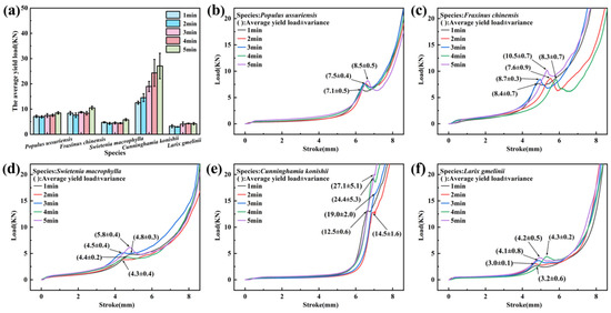 Compression tests under different preheating times. (a) The average yield load; (b) Populus ussuriensis; (c) Fraxinus chinensis; (d) Swietenia macrophylla; (e) Cunninghamia konishii; (f) Larix gmelinii.